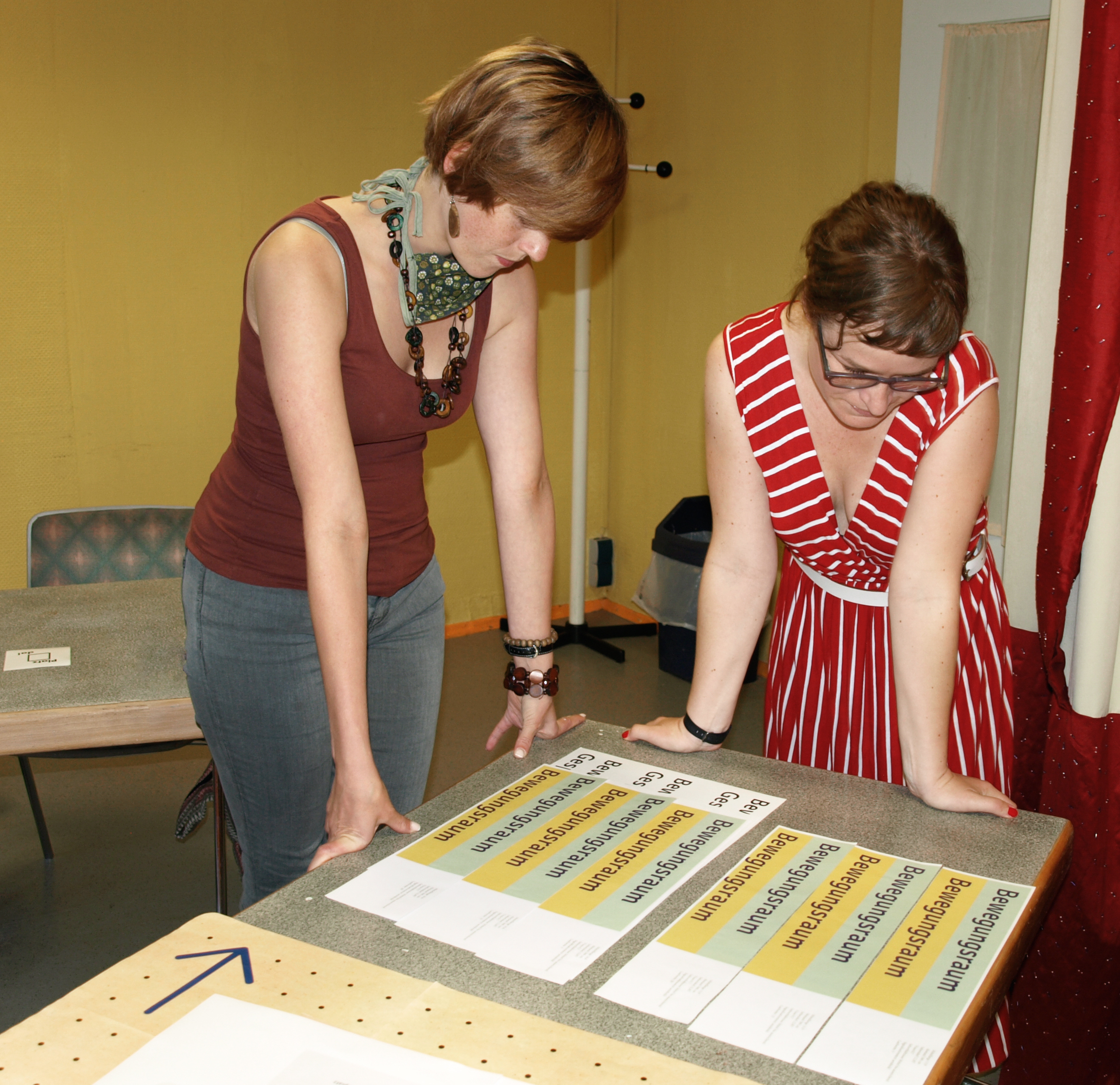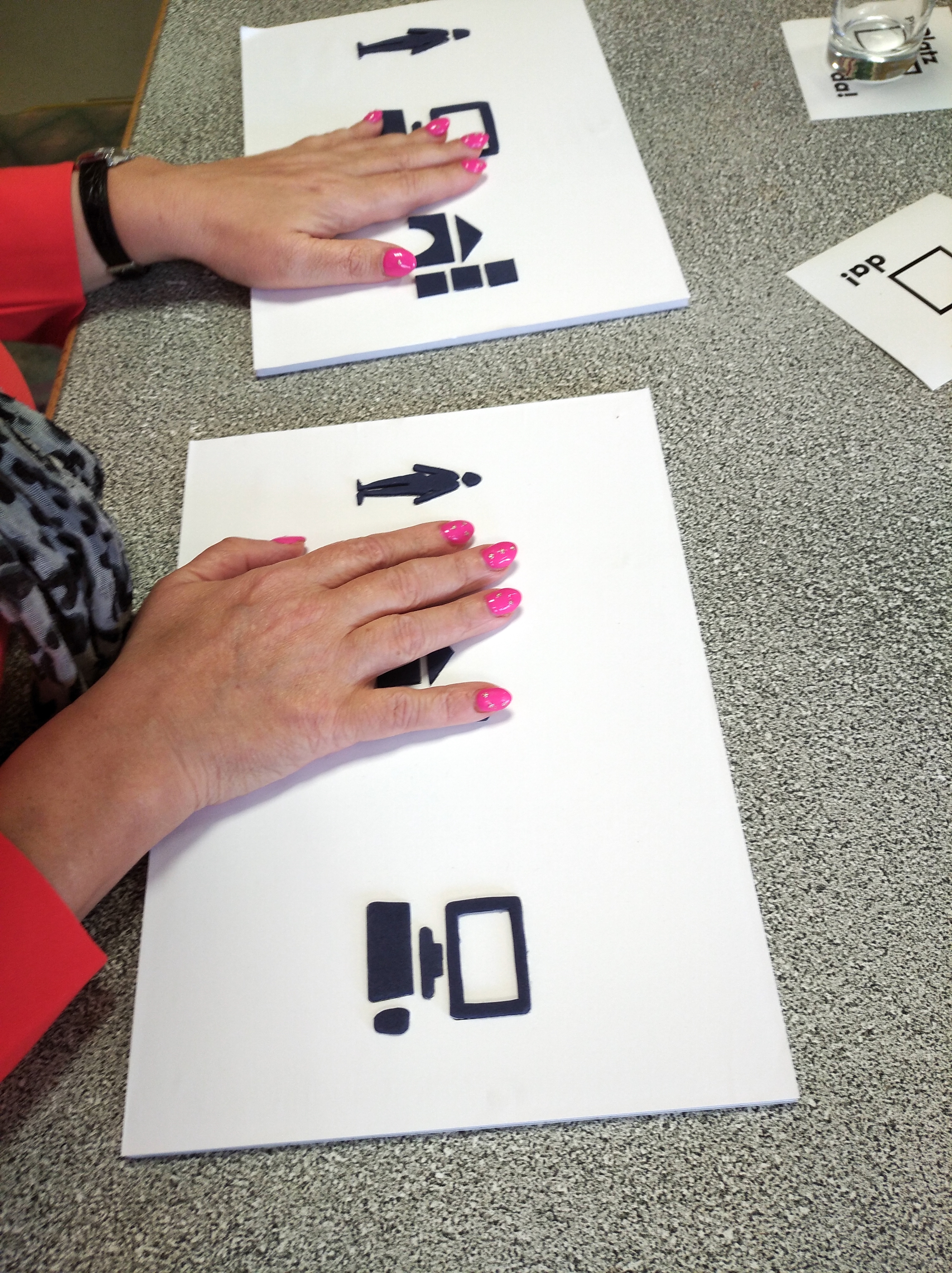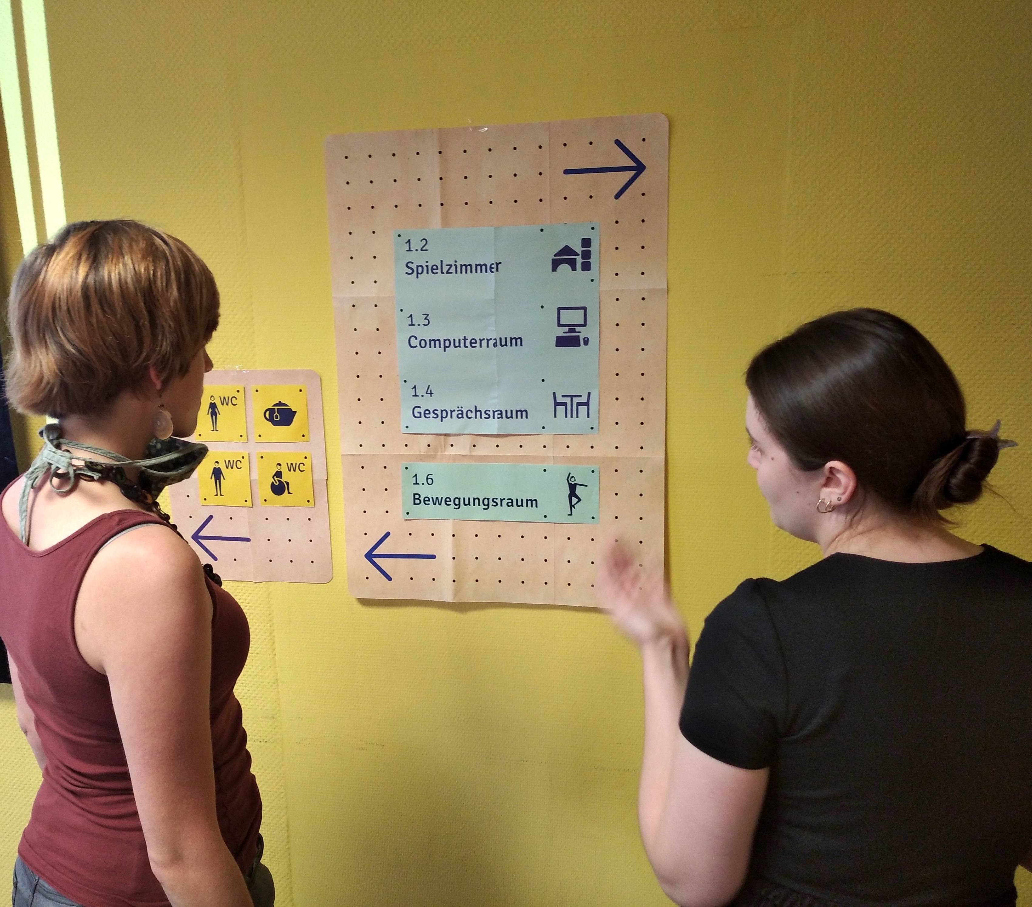 Wir haben über die Fotomappe berichtet, die den Weg vom Gleis der Bahnstation bis in die Kultureinrichtung erklärt…aber was passiert dann vor Ort? Wie muss ein gutes Leitsystem gestaltet sein? Auf den Bildern besprechen wir gemeinsam mit dem vska.bundesverband im Projekt “Stadtteilzentren inkluisv!” die Entwürfe eines Leitsystems von der Designerin Miriam Seith. Zudem prüfen wir, ob und wie das bisher visuelle Leitsystem zukünftig auch taktil gedacht werden kann.