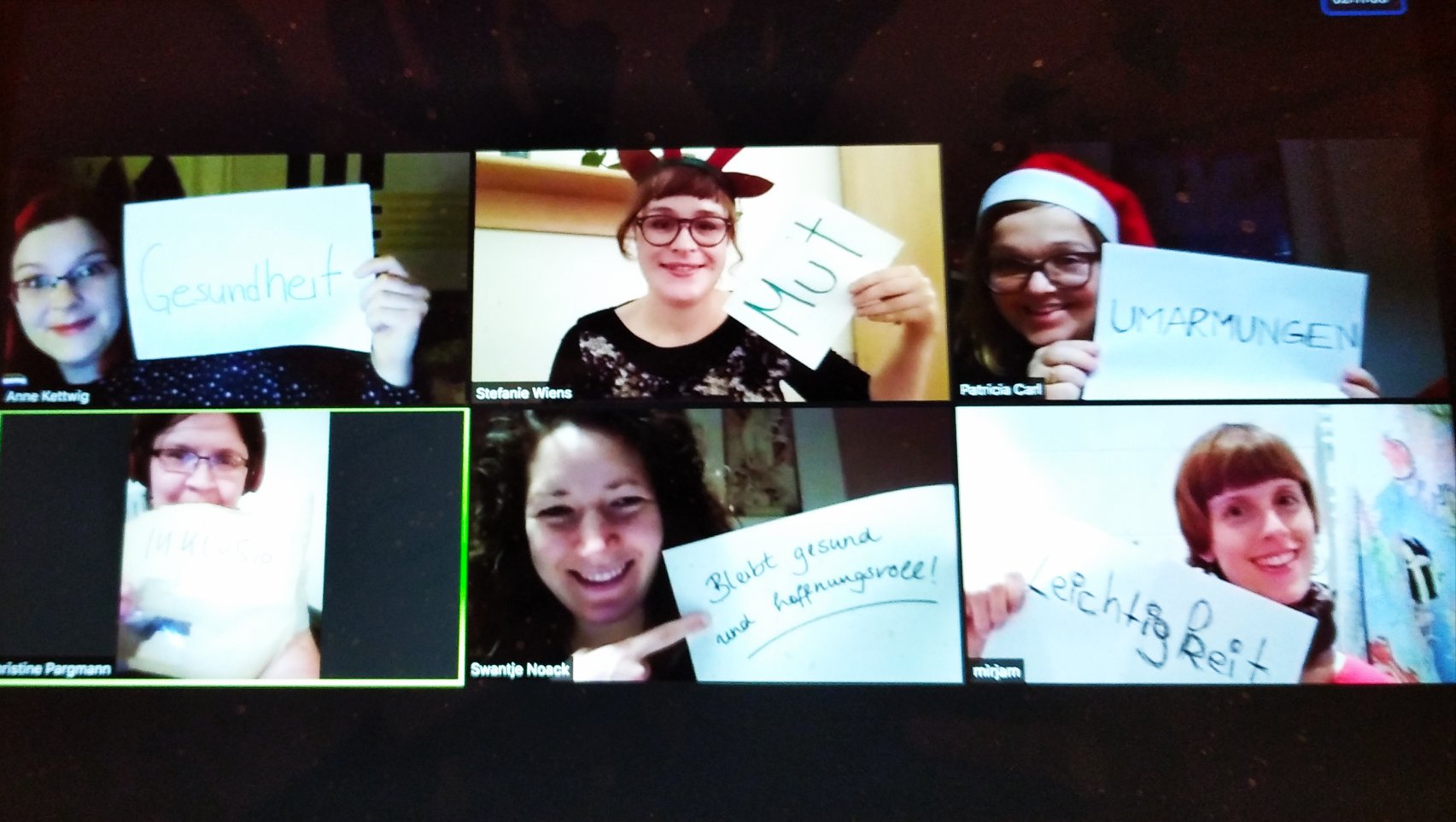 Wie dieses ganze Jahr, verlief auch unsere Weihnachtsfeier anders. Wir trafen uns online und packten unsere via Post geschickten Geschenke nacheinander aus – die Auspackenden zunächst mit geschlossenen Augen. So ertasteten und errieten wir die tollsten Überraschungen und waren sehr glücklich mit dieser sicheren Variante der Feierei. Diese ist auch Ausdruck flexibler Anpassung, einer Superkraft, die wir im Team inzwischen alle haben, denn Flexibilität ist immer gefordert in inklusiven Kontexten. In diesem Sinne wünsche wir allen Kund*innen, Kooperationspartner*innen und Unterstützer*innen: