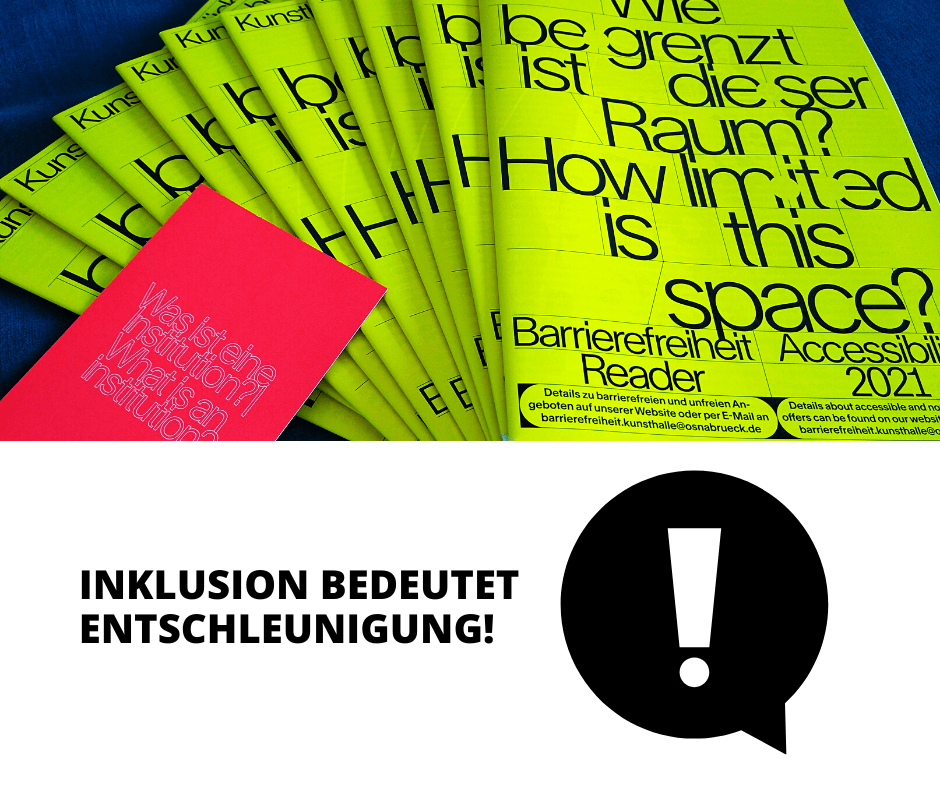 Bildbeschreibung: Ein Stapel neongelber Reader der Kunsthalle Osnabrück liegen auf einem blauen Sofa. Daneben liegt eine pinke Postkarte mit der Aufschrift: „Was ist eine Institution? What is an institution?“ Darunter befindet sich auf weißem Hintergrund der Satz: Inklusion bedeutet Entschleunigung! Daneben ist eine einfach Illustration einer schwarzen Sprechblase mit einem weißen Ausrufezeichen darin.