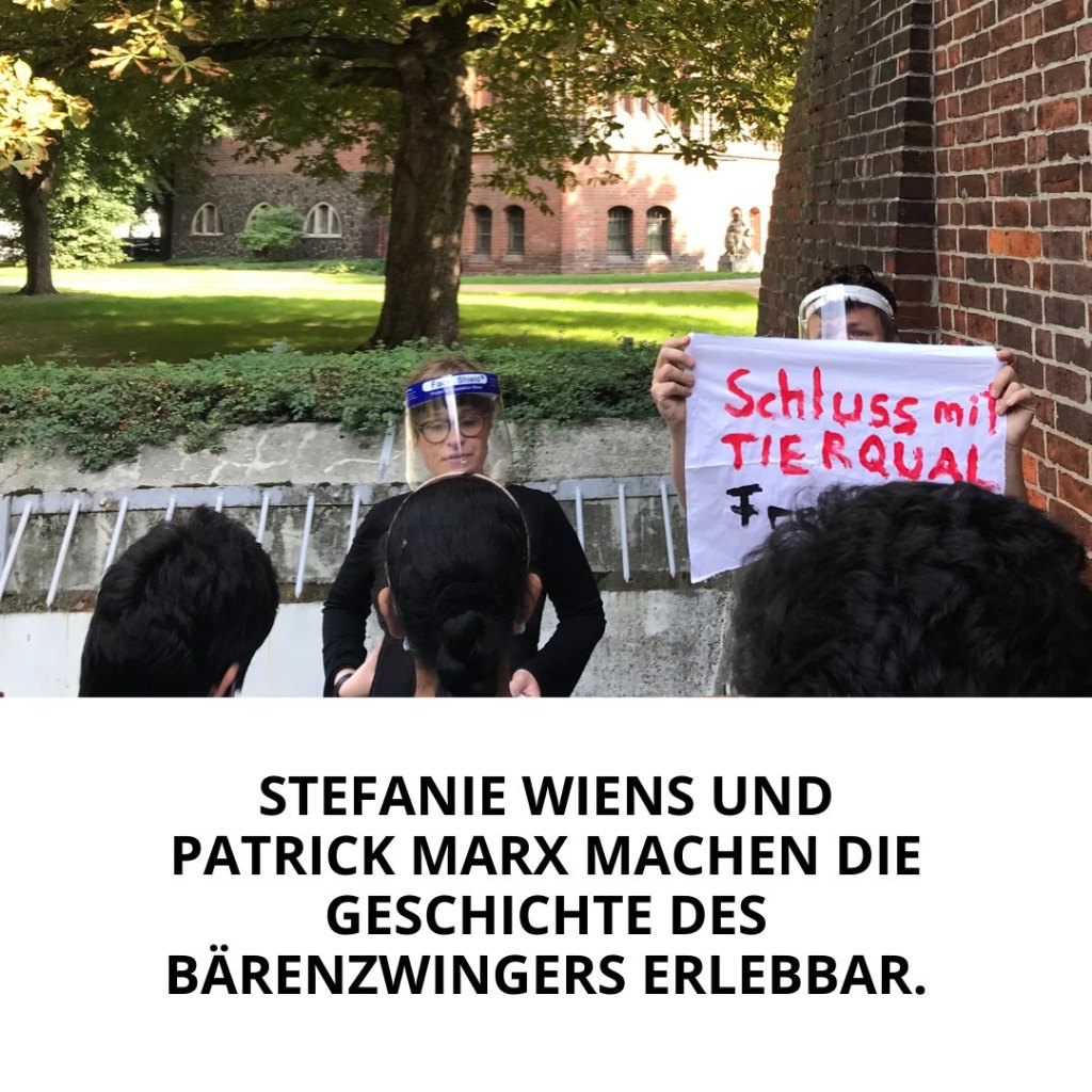 3. Stefanie Wiens und Patrick Marx aus dem <Platz da!> Team stehen im Bärenzwinger und sprechen mit einer Schüler*innengruppe. Unter dem Foto die Beschreibung: „Stefanie Wiens und Patrick Marx machen die Geschichte des Bärenzwingers erlebbar.“