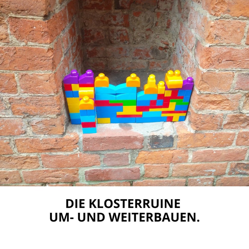 8. Mauer der Klosterruine Berlin mit einem Erker, der mit einer Mauer aus bunten Bausteinen am unteren Ende zugemauert wurde. Über dem Foto die Beschreibung: „Die Klosterruine um- und weiterbauen.“