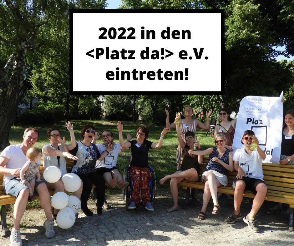 Ein Foto mit darübergelegtem Text. Das Foto zeigt eine Gruppe von Menschen im Park. Die Sonne scheint und alle sind sommerlich gekleidet. Die meisten sitzen in einer Reihe auf zwei Parkbänken und einige stehen hinter den Bänken und halten ein großes <Platz da!> Plaket. Die Gruppe besteht aus „bunten“ Menschen aller Farben und Formen aus dem <Platz da!> e.V. ; ) Alle jubeln und lachen. Darüber ist der folgende Text in einem weißen Kasten zu lesen: „2022 in den <Platz da!> e.V. eintreten!“.