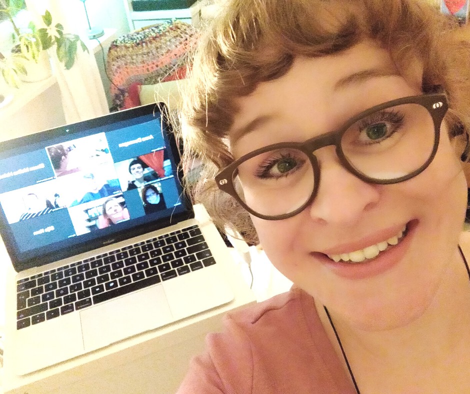 Bildbeschreibung: Zu sehen ist ein Foto: Stefanie Wiens lächelt in die Kamera. Sie hat ein hellbraunes T-Shirt an und eine Brille auf. Hinter ihr steht ihr Laptop auf dem Tisch. Auf dem Bildschirm ist die Zoom-Konferenz der <Platz da!> Mitgliederversammlung zu sehen.